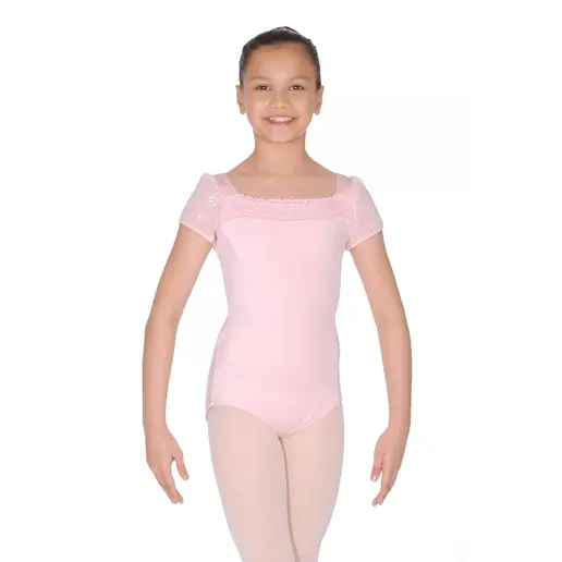 Beautiful soft leotard suitable not only for training but also for performances. It has delicate puff sleeves covered with tiny silver glitters. The front is slightly ruffled on the top. This ruffled part is also shimmering. The leotard is fully lined. The front has two vertical seams that shape the body. The back has a smaller U-shaped, lower neckline.