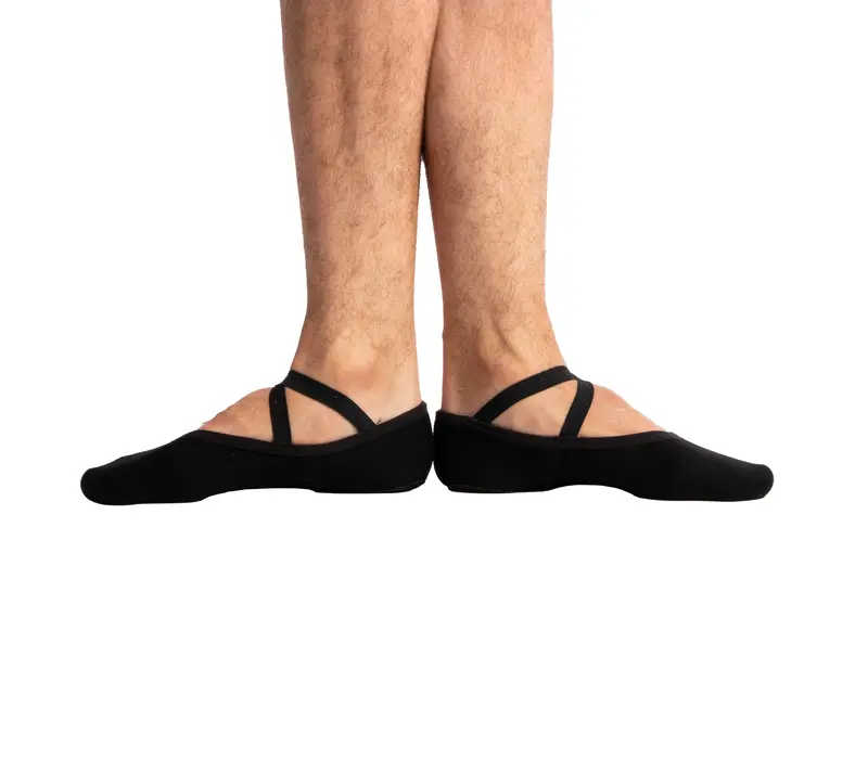 These men's elasticated ballet shoes with split leather soles have a very pleasant material. Ballet shoes have cotton and elastane on the inside. Two elastic bands and an elastic hem are cross-stitched across the tarsus. They are suitable for all foot types, and they fit nicely. For wider feet, we recommend taking a size larger than your normal size.