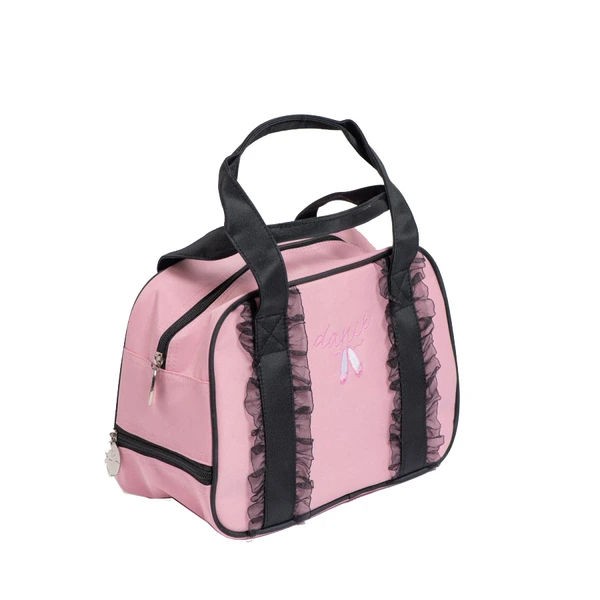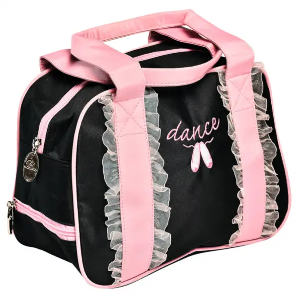 Simple yet beautiful handbag for trainings. There is an embroidered picture of ballet shoes and a Dance writing on the front. Black version is in combination with pink ruffled stripes.