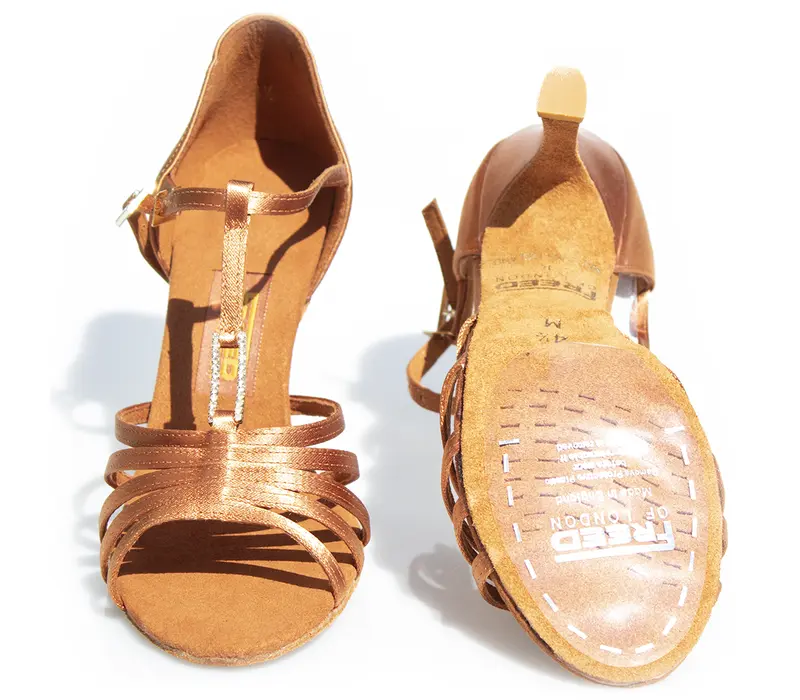 Quality Latin with five stripes across the headboard, with a T bar, which is complemented by a beautiful, elegant detail of shiny stones. They also lift simpler clothes, give them uniqueness. The top stripe nicely holds the foot on the insole of the shoe, they are very comfortable and suitable for narrow to medium-wide feet. We do not recommend them for wide feet in the metatarsal part. They are made in England.