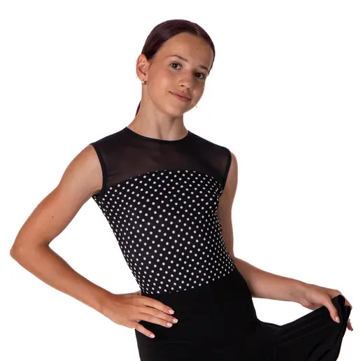 Dance leotard for girls has beautiful clean lines. Elastic material with a dotted pattern is combined with mesh. The hem around the neck and on the shoulders is also elastic. A beautiful, simple piece that lets the dance moves stand out. Material: 100% polyester. Hand-wash in cold water with a mild detergent and let air dry.