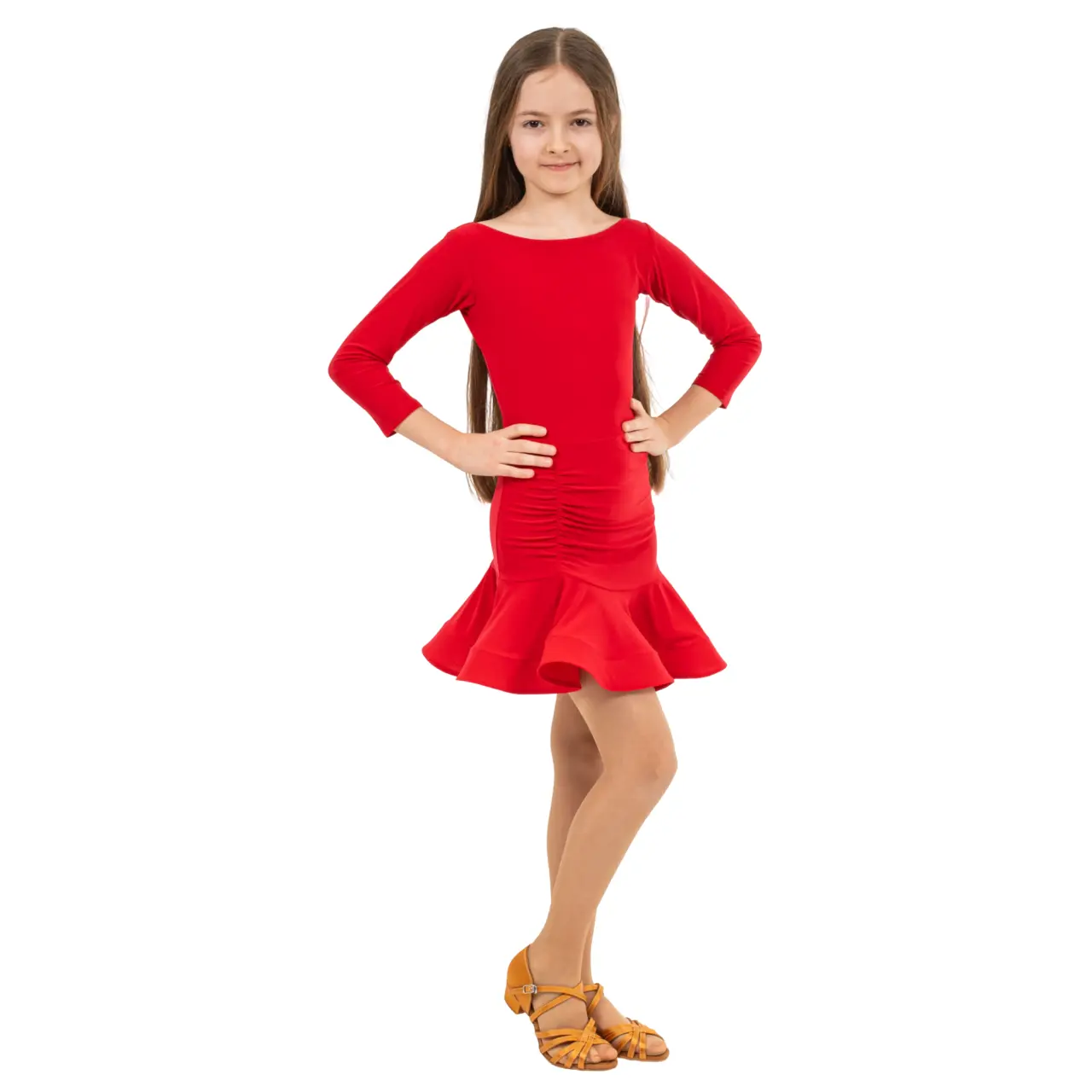 The boat neckline in the front, the soft V-neckline in the back, the three-quarter sleeves add sophistication to the dress, while the ruched skirt with ruffles brings playfulness and energy. Movement on the dance floor will make it look dynamic and elegant.