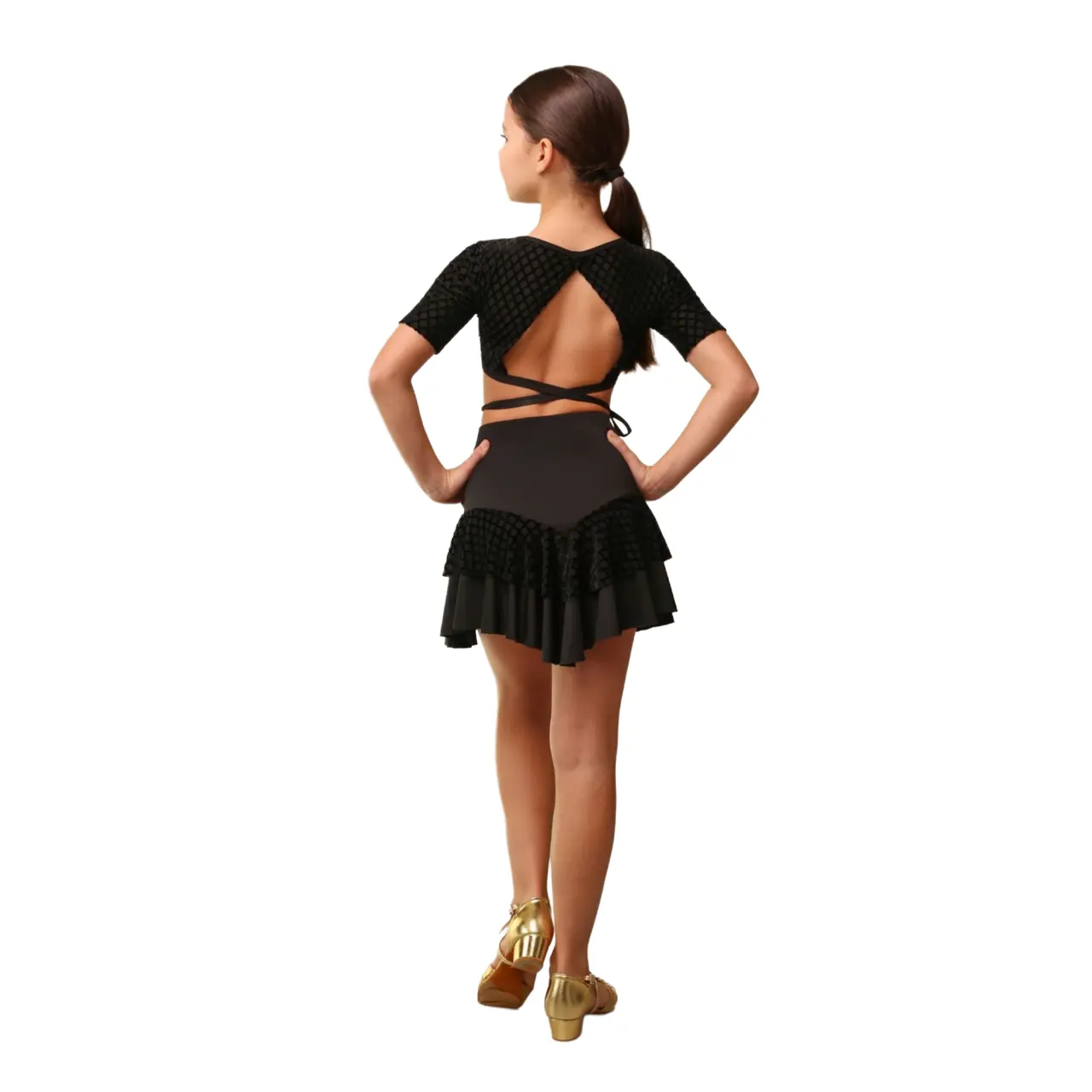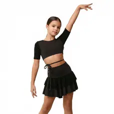 The girls' dance top Iona from the MINI NOIR collection stands out with its elegant design intended for Latin American dances. The striking open back combined with adjustable tying allows customization as needed while reliably staying in place during movement.