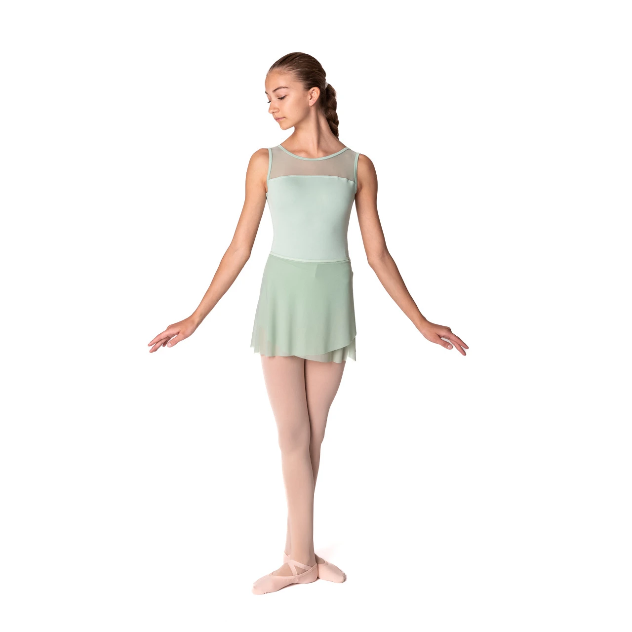 A beautiful boat cut in the front part of the leotard is combined with mesh. Wide shoulder straps extend into a deeper V-shaped back neckline. The back is gently gathered to ensure the leotard fits snugly and smoothly against the body without gaping. The material is light, pleasant, and airy polyamide and micro mesh. Hand wash in cold water and let air dry.