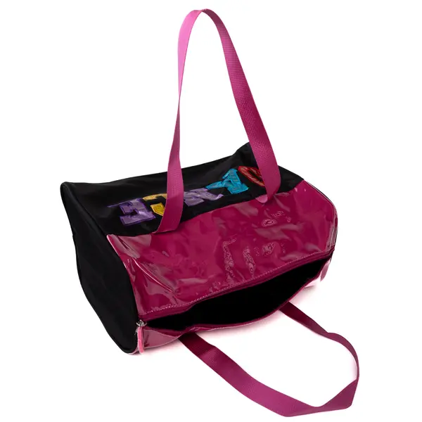 The practical black colour is enlivened by the colourful letters "DANCE". The bag has the shape of an elongated cylinder. It closes with a zipper which has a pattern of ballet pointe shoes. Three pockets inside are used for storing small items. The top of the bag is waterproof, coated with translucent waterproof material. Its measurements are 33,5 cm in length, 24,5 cm in height, and 19,5 cm in depth.